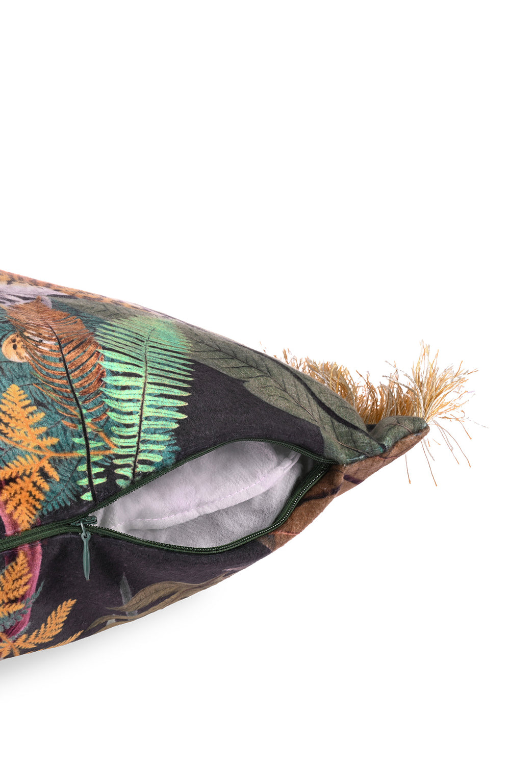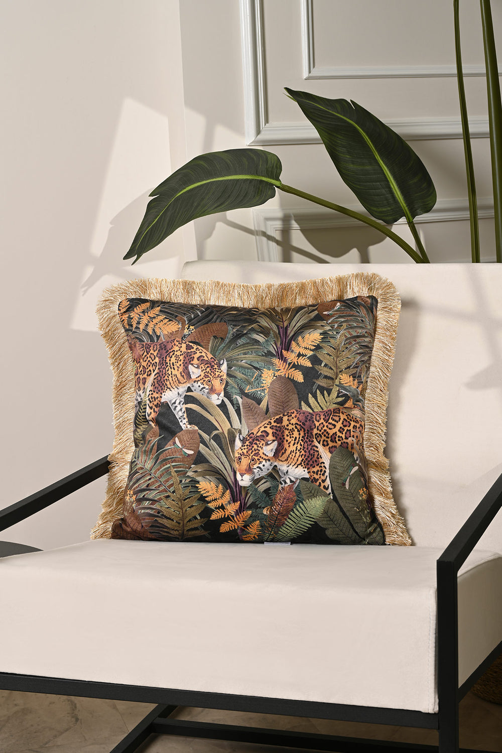 Bringing the exotic beauty of nature to your home , the Exotic Tropical Leopard Design Velvet Cushion Cover with Fringed Detail adds a sophisticated touch to your living spaces with its elegant design. Reflecting the vibrant energy of nature with its leopard and tropical leaf details, this cushion cover is complemented by gold fringing details for a chic look.
