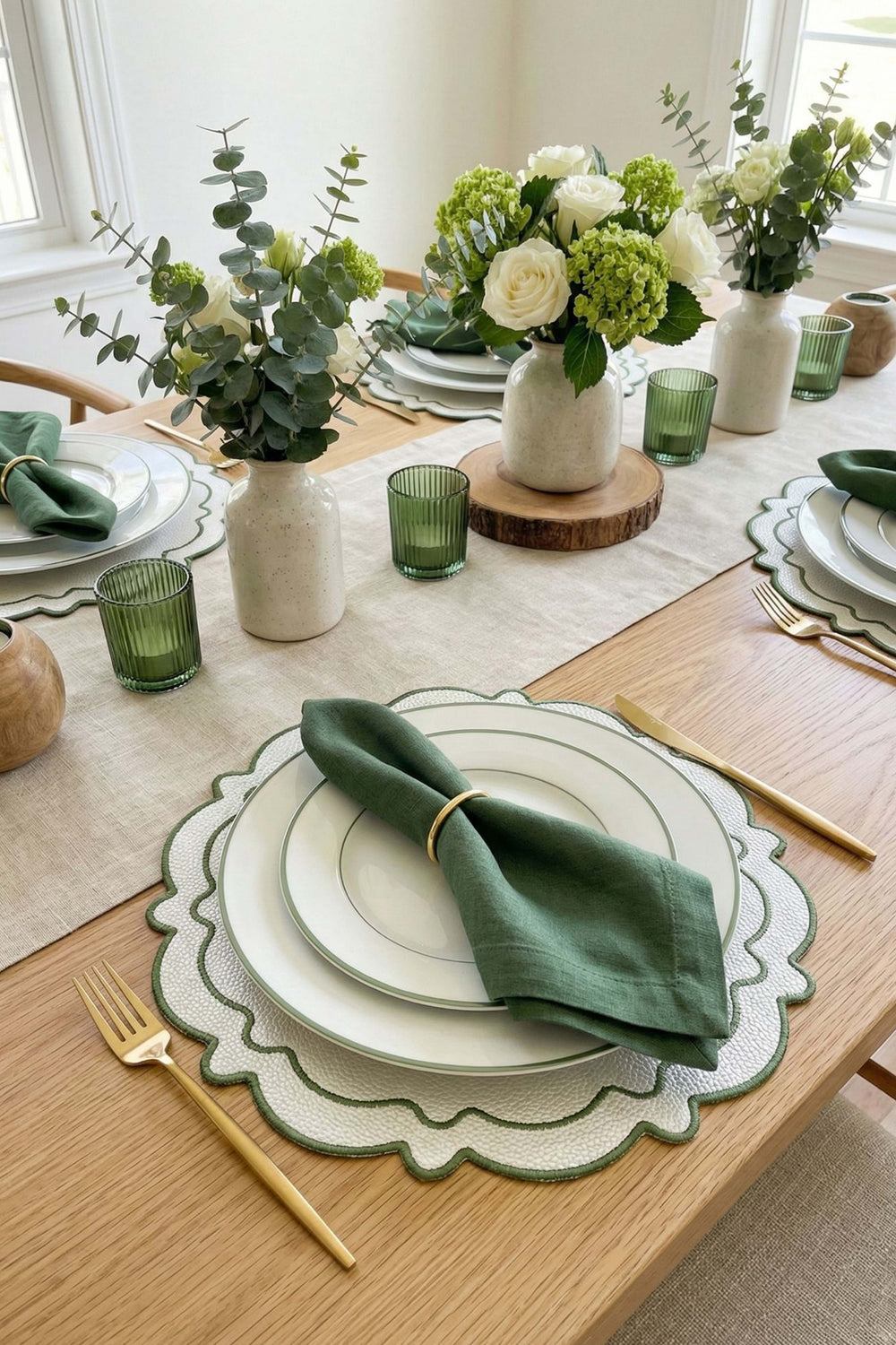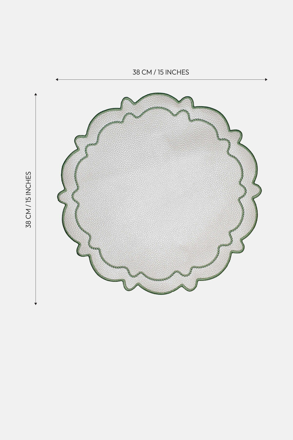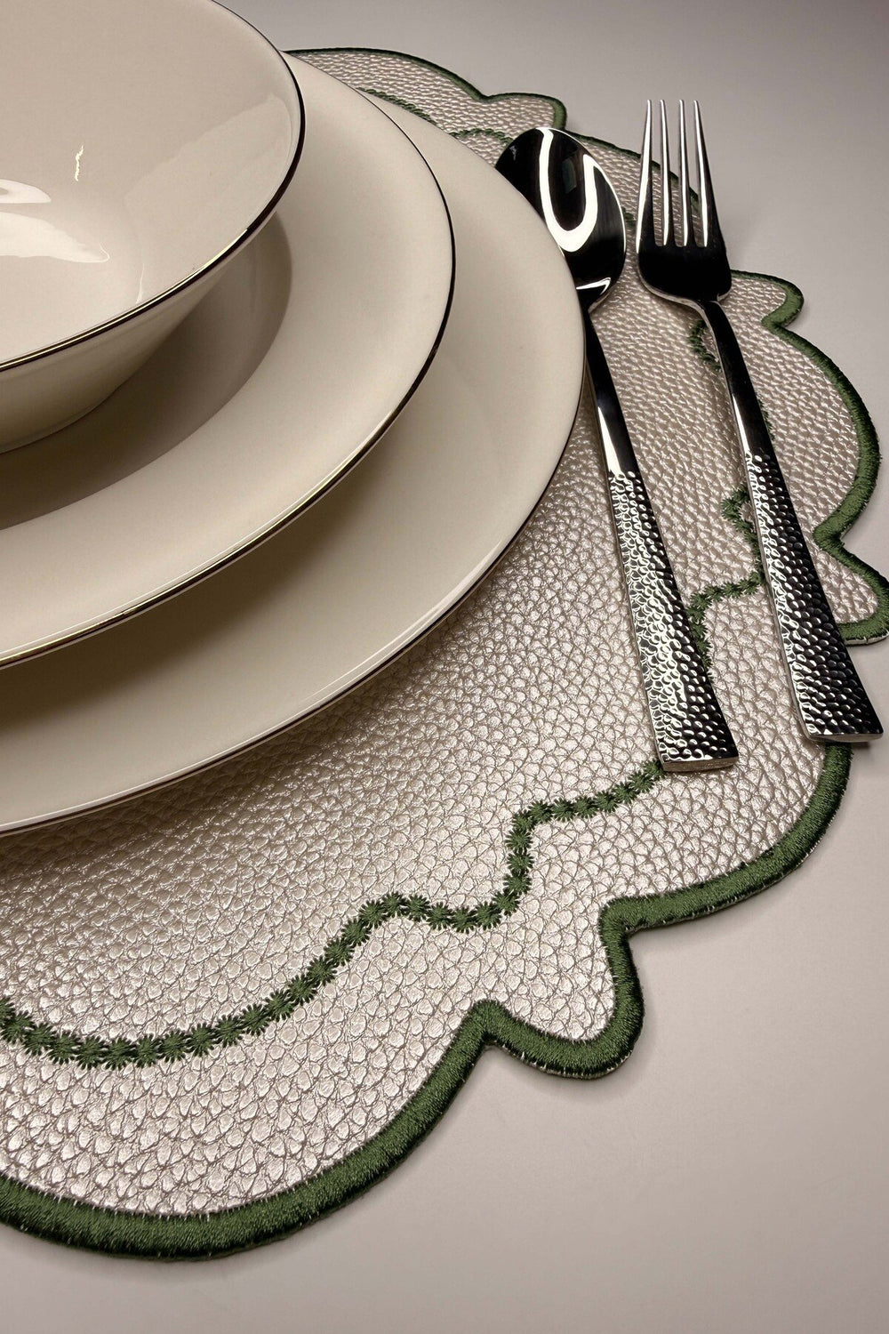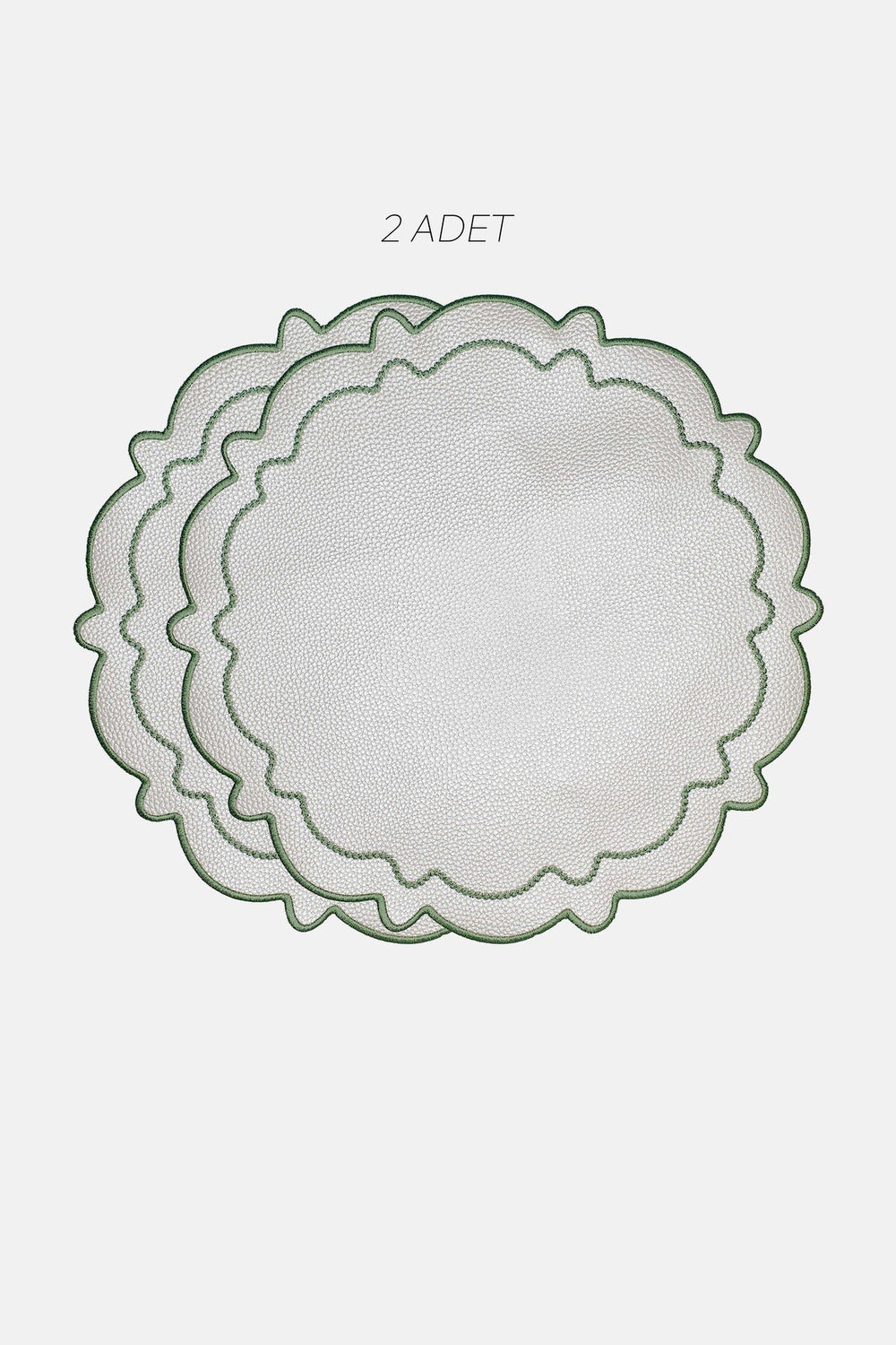 Dalga formundaki scallop kenarları ve zarif nakış detaylarıyla öne çıkan Ripple Amerikan servis seti, sofralarınıza sade ama etkileyici bir şıklık katıyor. İnci beyaz tonuyla her dekorasyon stiline uyum sağlar. Dayanıklı suni deri malzemesi sayesinde hem estetik hem de pratik bir kullanım sunar. İki adet olarak sunulmaktadır.