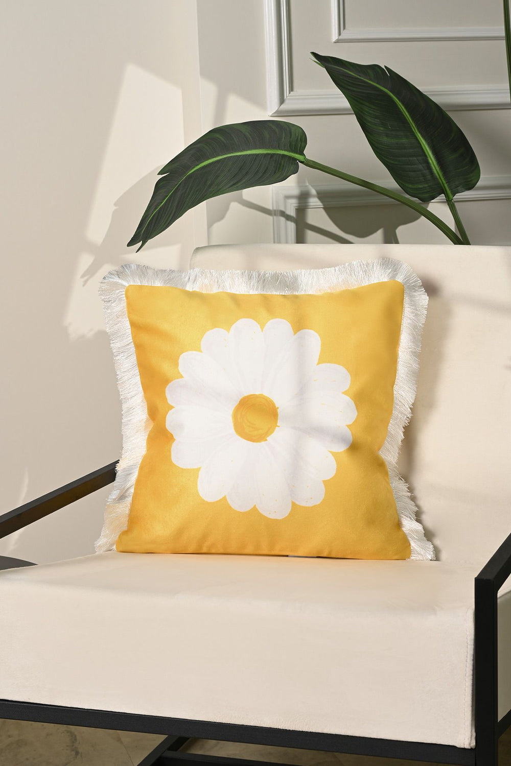 Bringing the warmth of sunshine and the joy of spring to your home , the Daisy Patterned Yellow Fringed Cushion Cover is a great choice for a natural and energetic decoration! The large white daisy pattern placed on a vibrant yellow background creates a positive atmosphere, while the white fringed details add an elegant touch.