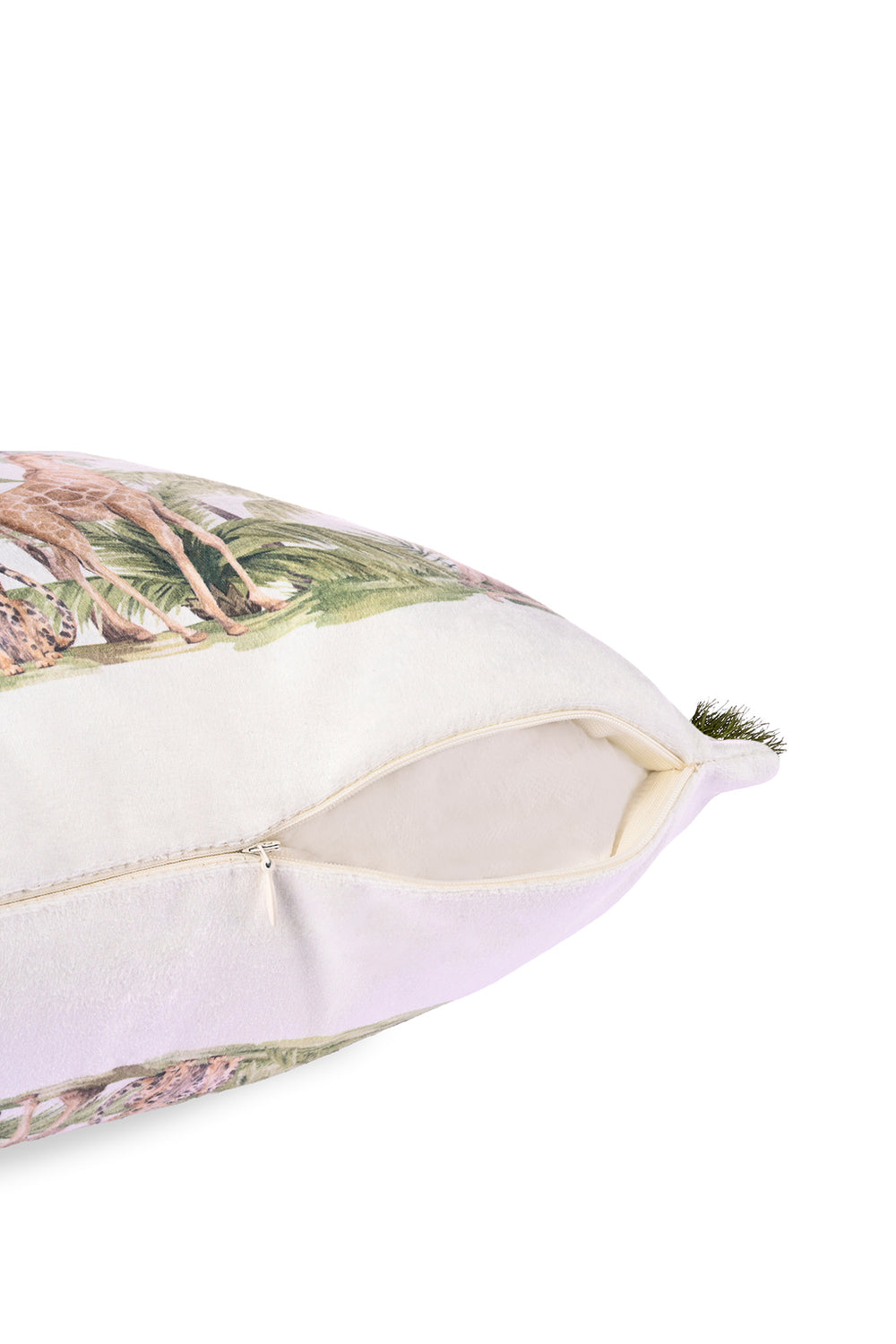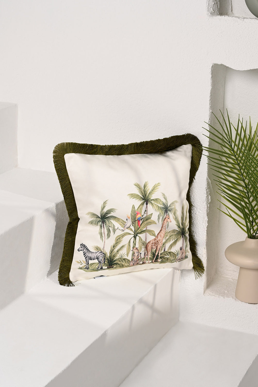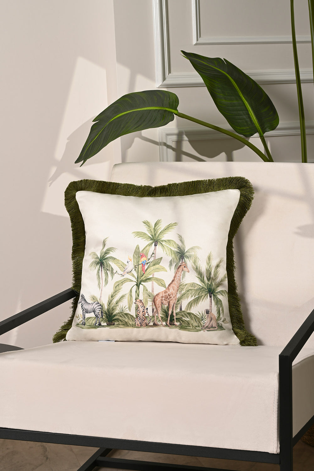 Bringing the exotic beauty of nature to your home , the Tropical Safari Pattern Fringed Cushion Cover adds a sophisticated touch to your living spaces with its elegant design. Reflecting nature's vibrant energy with its giraffe, zebra, parrot, and tropical plant details, this cushion cover is complemented by green fringing details for a stylish look.