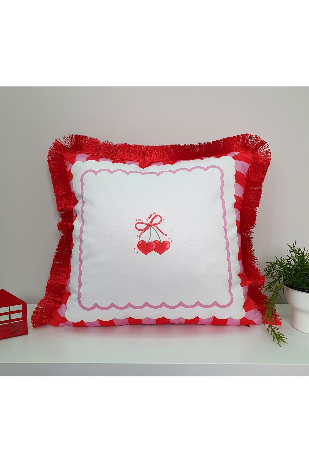 The Sweet Cherries Patterned Red Fringed Cushion Cover , with its romantic and energetic design, adds a sweet touch to your living spaces. The harmony of red and pink tones, combined with the charming cherry illustration at the center, creates a warm and playful atmosphere. Red fringing details around the edges add a touch of dynamism to the decor.