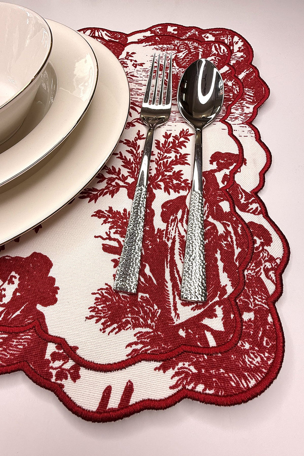Sanatsal toile desenleriyle bezenmiş Tableau Amerikan servis seti, pastoral sahneleri zarif bir şekilde sofralarınıza taşır. Scallop formundaki nakışlı kenarları ve yeşil tonlarıyla hem nostaljik hem de şık bir görünüm sunar. %65 pamuk ve %35 polyester karışımı kumaştan üretilmiştir. İki adet olarak sunulmaktadır.