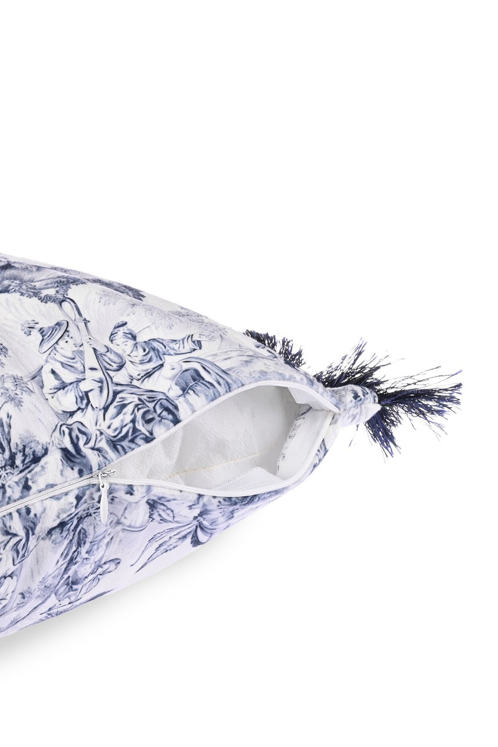 This special cushion cover, featuring a French-inspired toile pattern complemented by navy blue fringe details, adds classic elegance to any interior. Its soft velvet texture and high-quality print combine aesthetics and comfort.