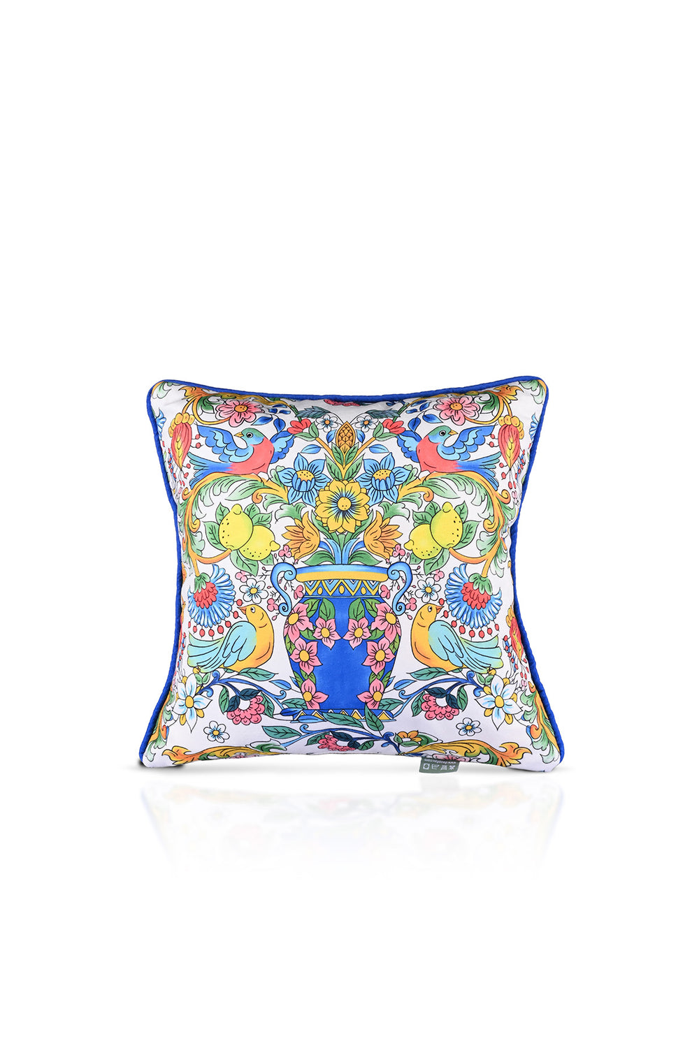 Bu enerjik dekoratif kırlent, tropikal kuşlar ve çiçek desenleriyle yaşam alanınıza renk ve canlılık katıyor. 43x43 cm ebatlarında olup, kaliteli leke tutmayan kumaşı ve uyumlu gizli fermuar detayıyla hem şık hem de pratik kullanım sunar.