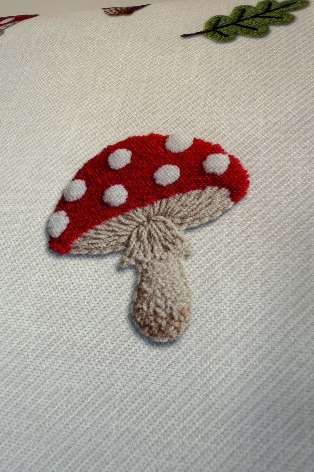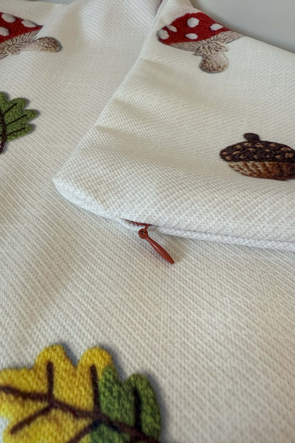 Bir sabah, ormanın derinliklerinde yürürken karşılaştığınız renkli mantarlar, dökülen yapraklar ve minik palamutlar... Bu kırlent, o anın büyüsünü evinize taşıyor. Nakış detaylarıyla doğanın zarafetini yansıtan bu tasarım, mevsim geçişlerinin huzurunu yaşam alanınıza katıyor.