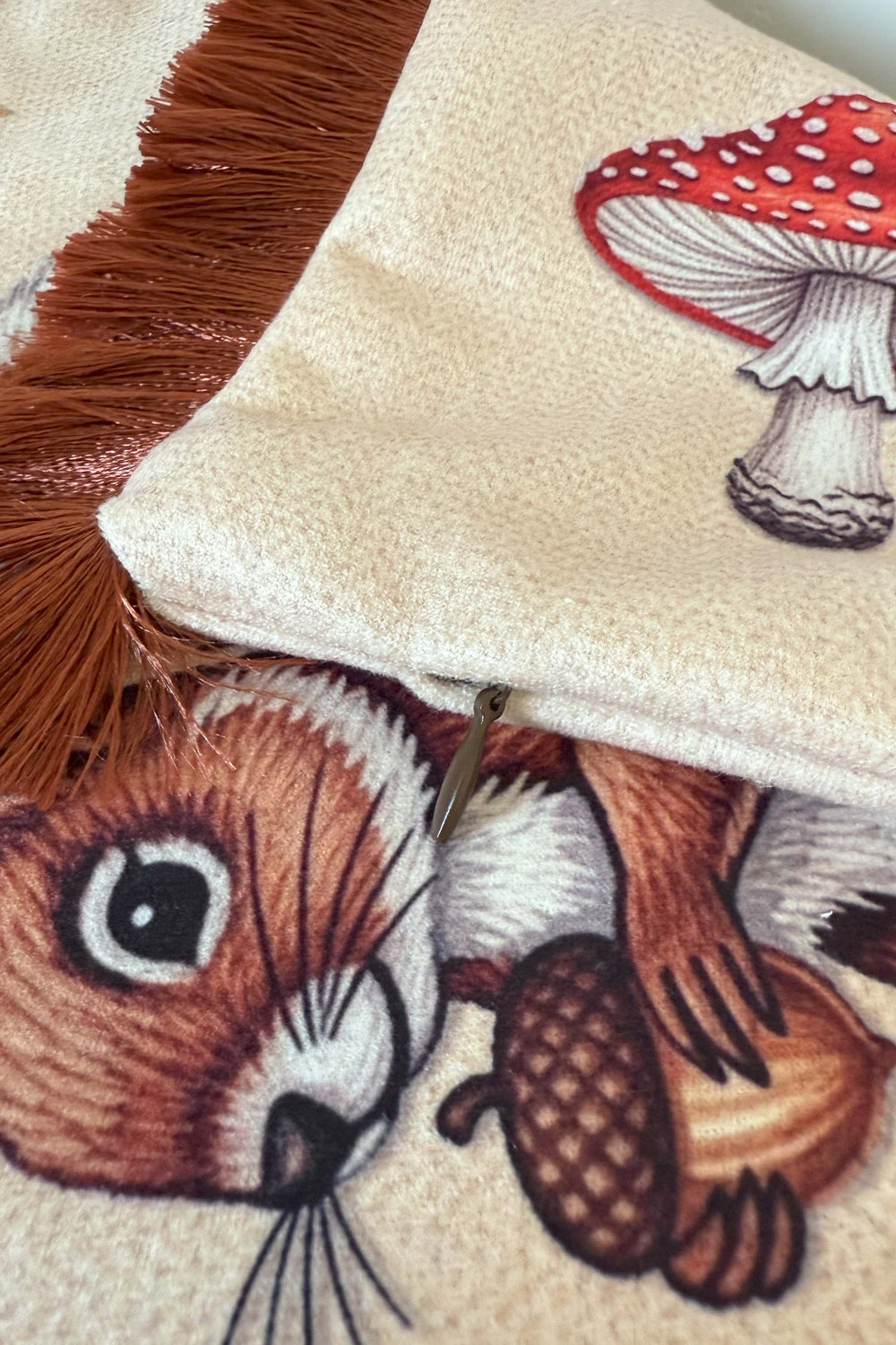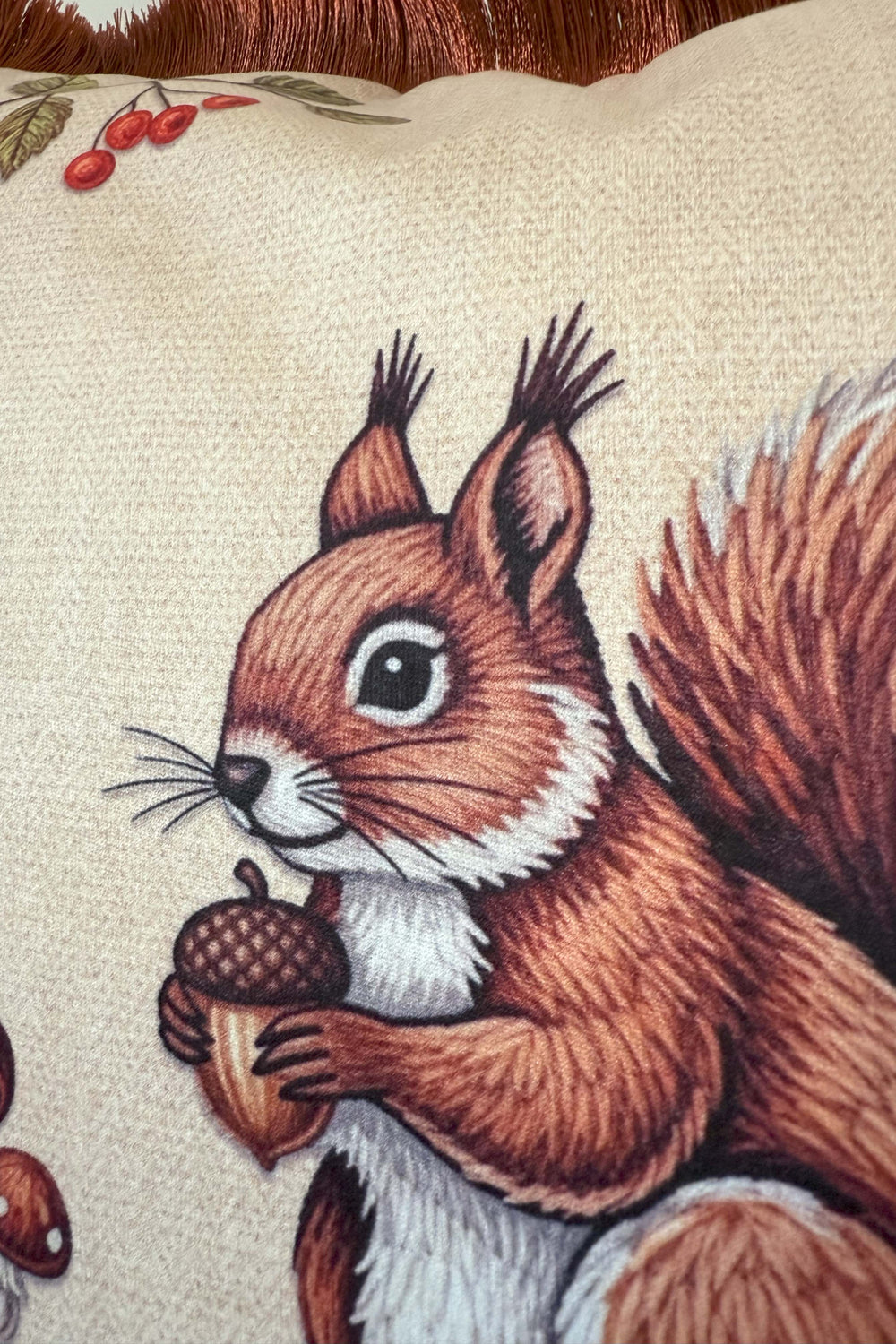 Bir sonbahar sabahı, minik bir sincap elinde palamuduyla ormanın derinliklerinde gezinir. Mantarların arasından geçer, yaprakların üstünde zıplar... Bu kırlent, doğanın neşeli ritmini ve mevsimin renklerini evinize taşıyor. Kızıl püskülleriyle rustik bir dokunuş sunarken, detaylı nakışlarıyla adeta bir hikâye anlatıyor.