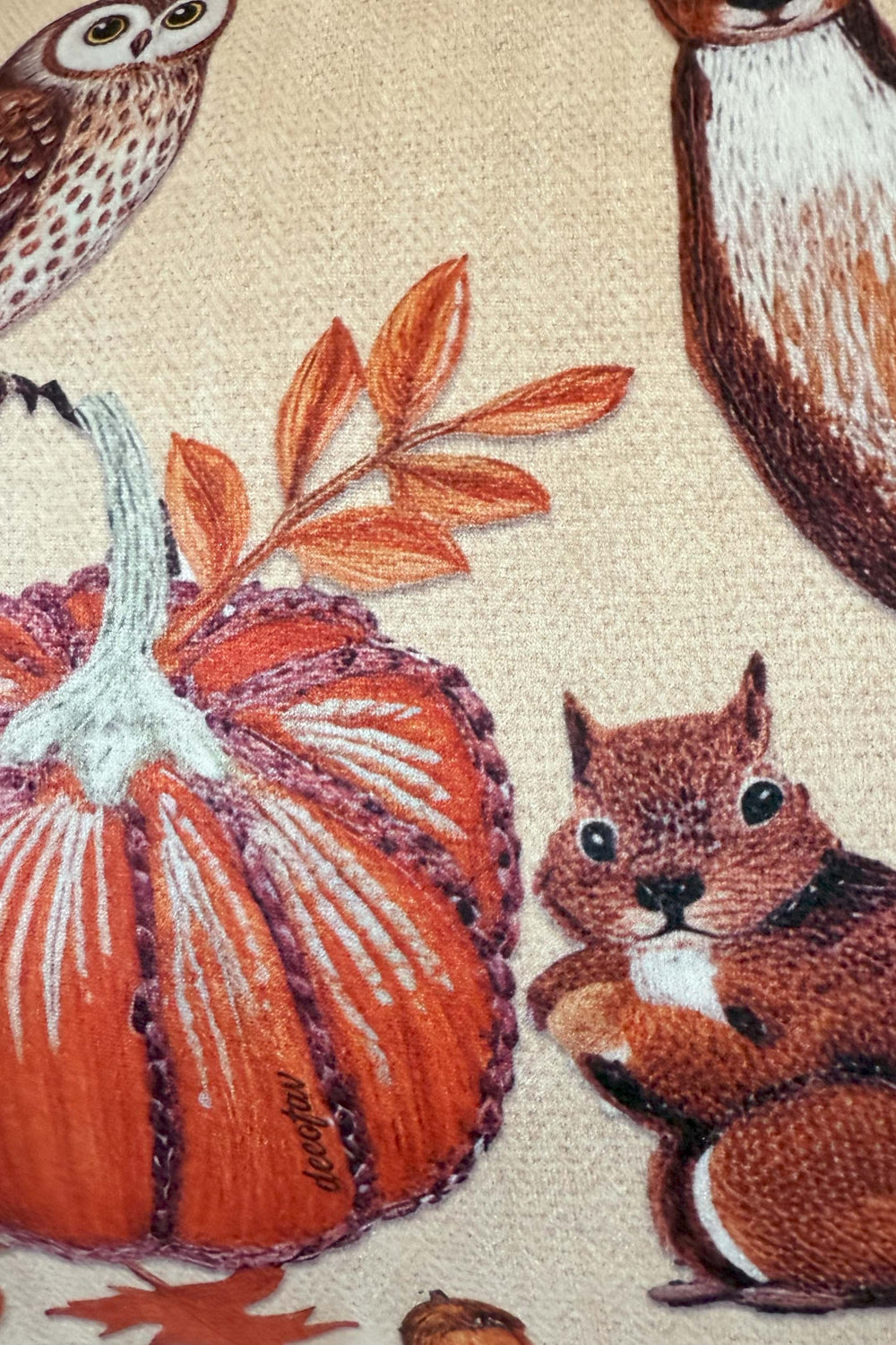 Bir sabah, ormanın derinliklerinde sessiz bir kutlama başlar. Rakun yaprakların arasında gezinir, baykuş balkabağının üstünde sabahı selamlar, geyik ve sincap ise palamutların peşinde... Bu kırlent, doğanın en sevimli sakinlerini bir araya getirerek evinize mevsimsel bir neşe katıyor. Kırmızı püskülleriyle sıcak bir dokunuş sunuyor.