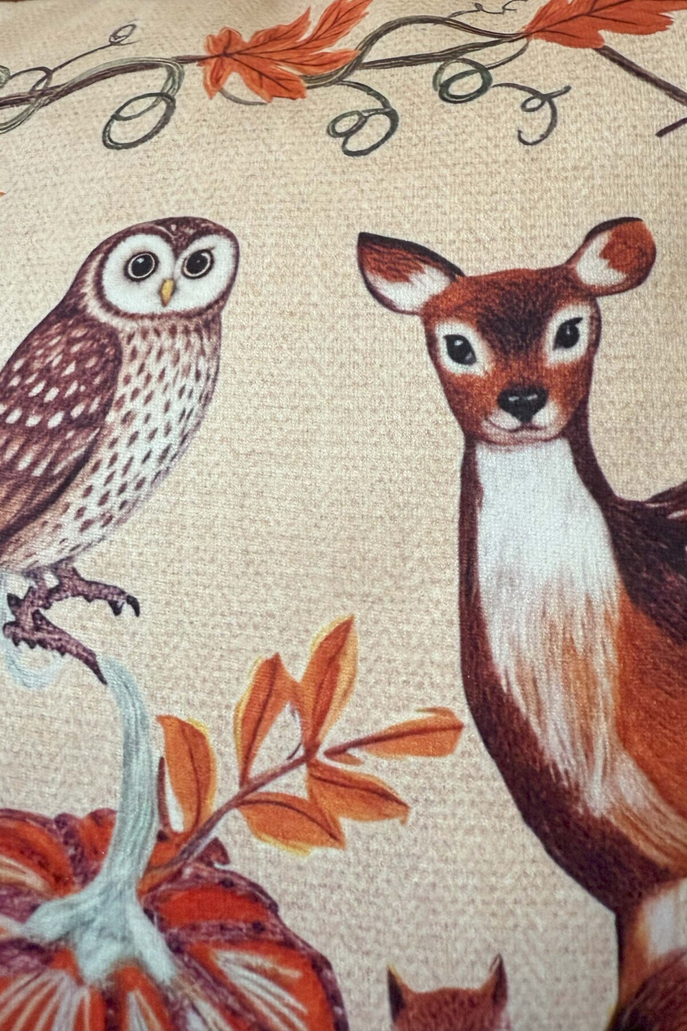 Bir balkabağının etrafında toplanmış rakun, baykuş, geyik, sincap ve çizgili sıçan... Bu kırlent, ormanın sessiz sakinlerinin sonbahar sohbetini evinize taşıyor. Her bir detay, mevsimin renkleriyle doğanın neşesini bir araya getiriyor. Kızıl püskülleriyle sıcak bir dokunuş sunarken, tasarımıyla çocukluk masallarını anımsatıyor.