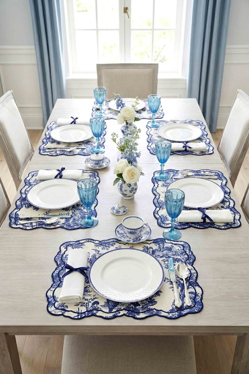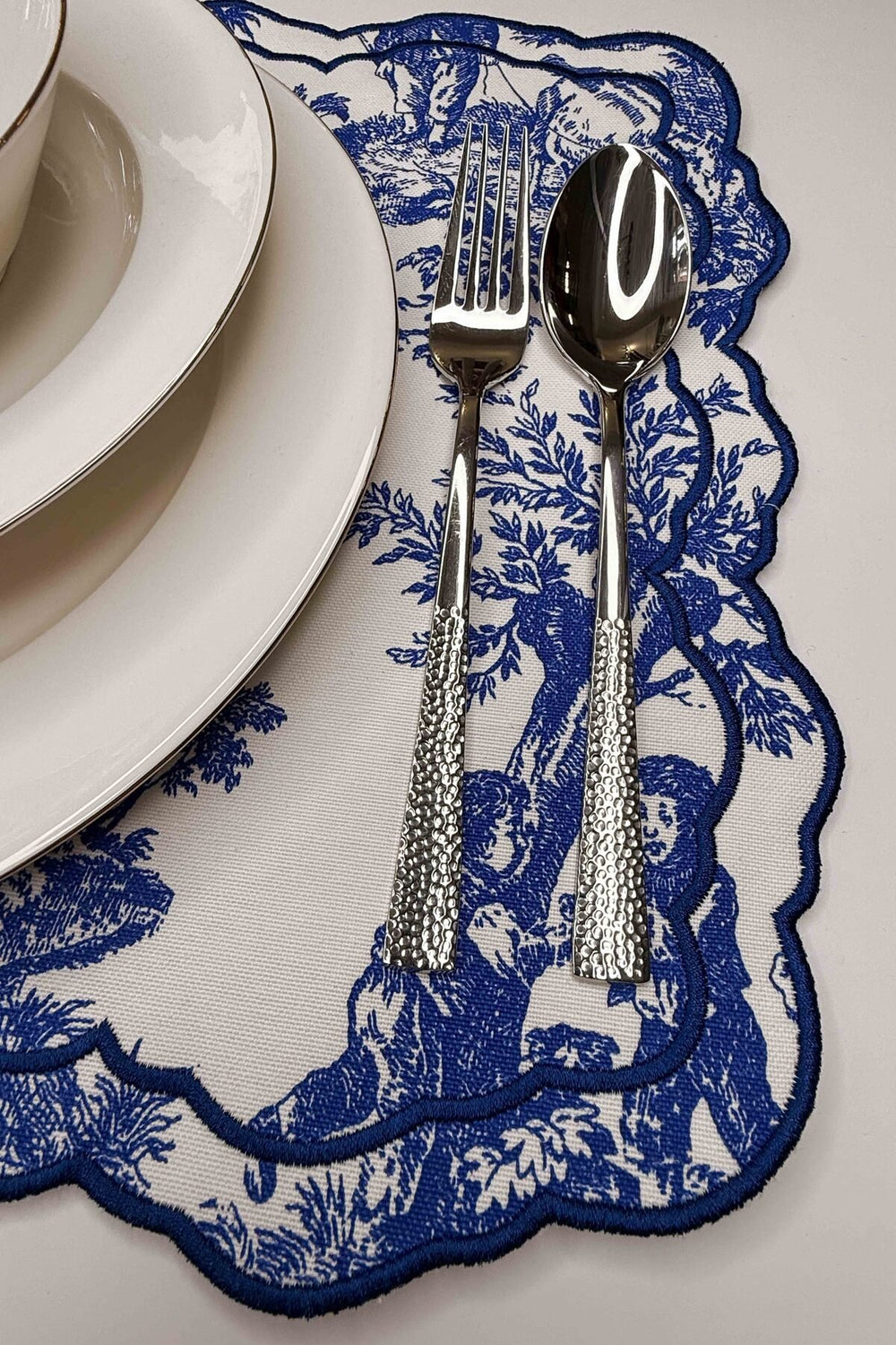 Sanatsal toile desenleriyle bezenmiş Tableau Amerikan servis seti, pastoral sahneleri zarif bir şekilde sofralarınıza taşır. Scallop formundaki nakışlı kenarları ve yeşil tonlarıyla hem nostaljik hem de şık bir görünüm sunar. %65 pamuk ve %35 polyester karışımı kumaştan üretilmiştir. İki adet olarak sunulmaktadır.